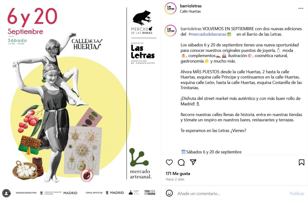 El Mercado de las Ranas es una actividad de puertas abiertas en la que los establecimientos comerciales del Barrio de las Letras abren sus puertas los primeros sábados de cada mes, sacando a la calle su oferta comercial, y convirtiendo al barrio en un mercado abierto. Además, los establecimientos de hostelería ofrecerán numerosos atractivos para aportar una oferta integral a todos los visitantes.